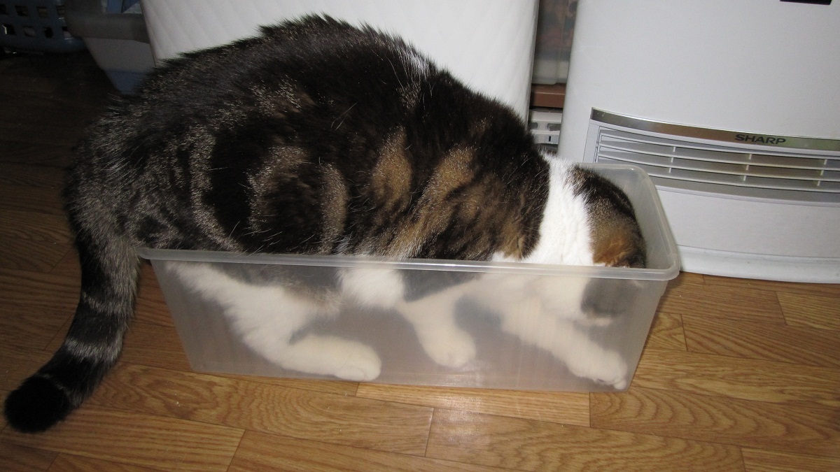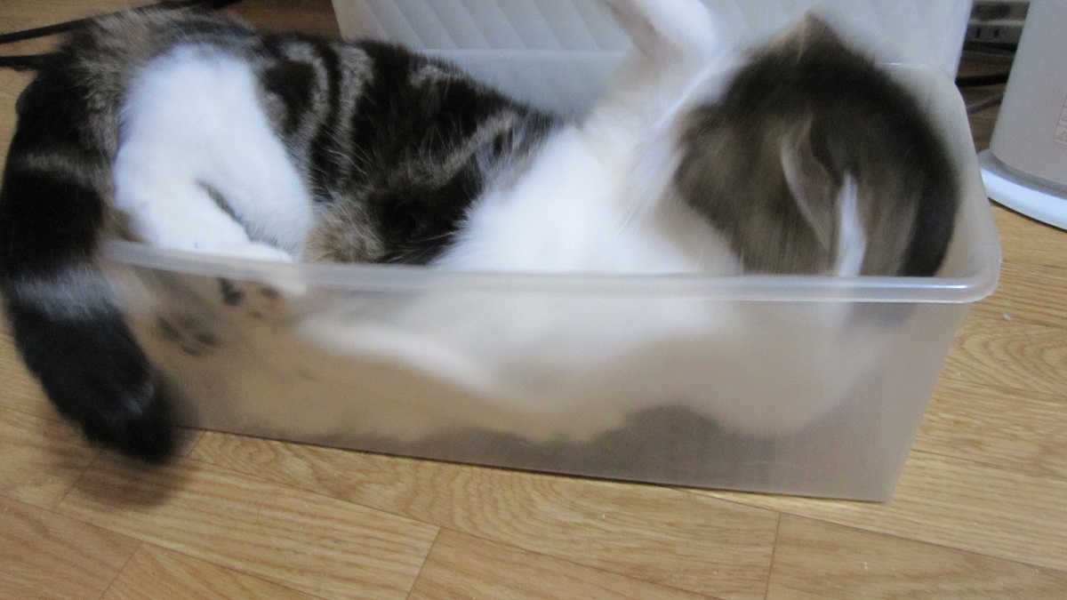 昨日の片付けでいらなくなった入れ物に入って遊ぶこのちゃん…