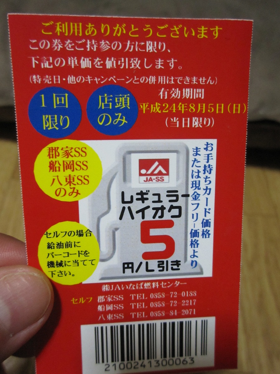 地元のJA農協のガススタでは『8月5日のみ、ガソリンリッター5円引き』券を配ってくれました♪