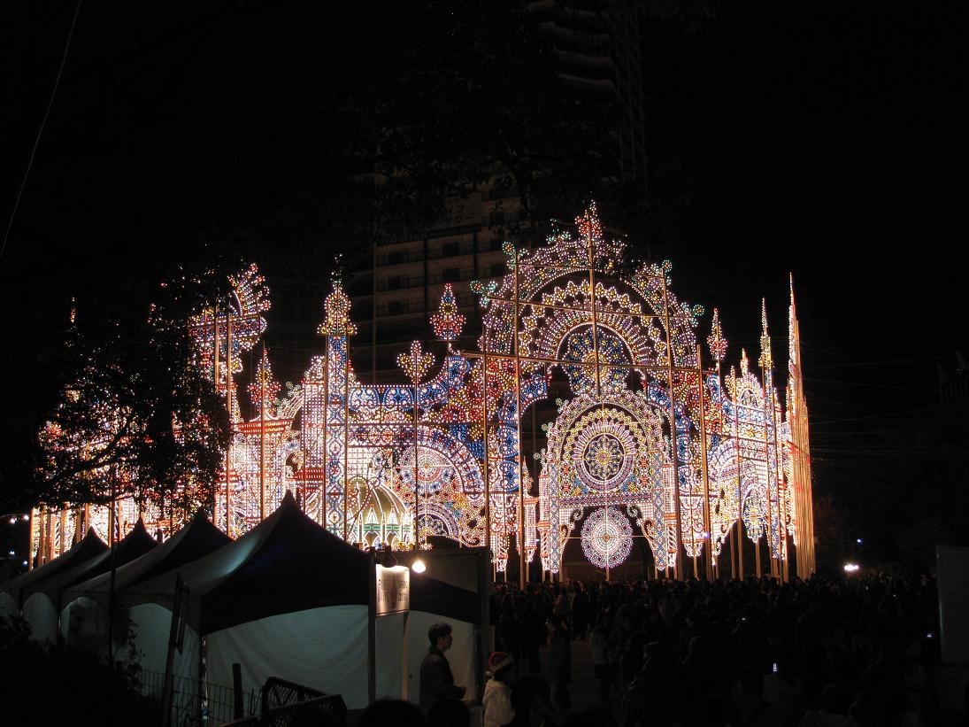 会場が近付くと光のアーチが並んでいて、賛美歌(?)的な綺麗な音楽が結構な音量で流れています。