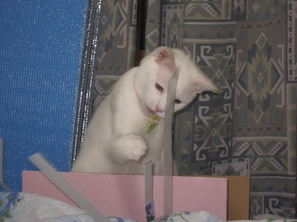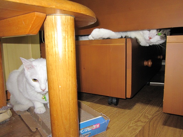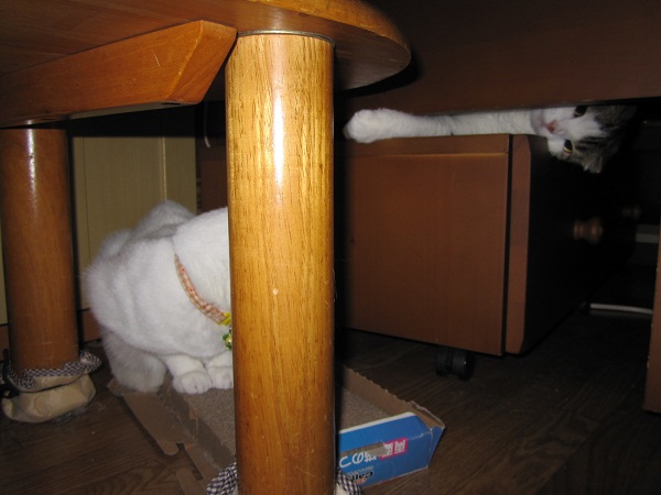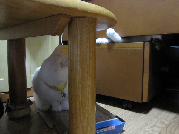 このちゃんはベッドの下に潜って、前足でネコパンチ炸裂。