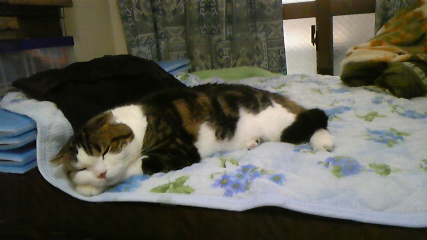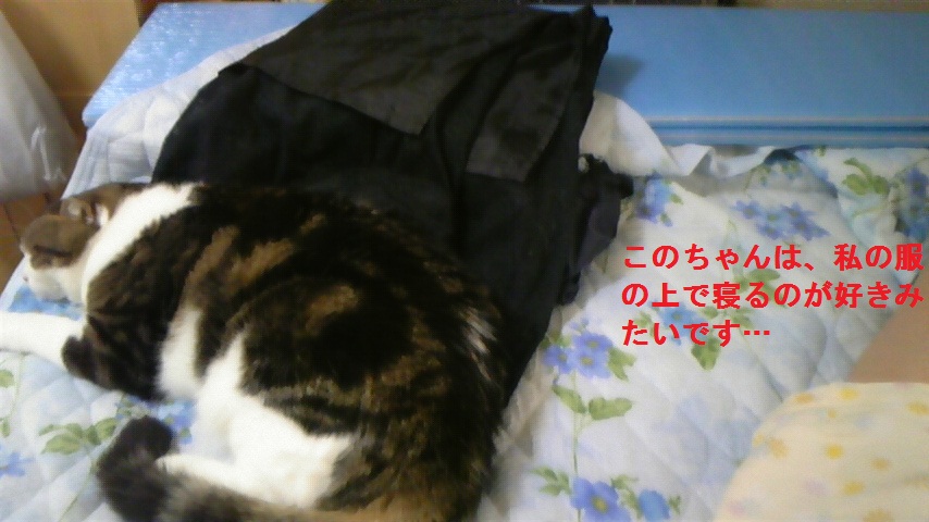 で、部屋に戻ると、このちゃんは私が脱いだ服の上に乗っかっています。