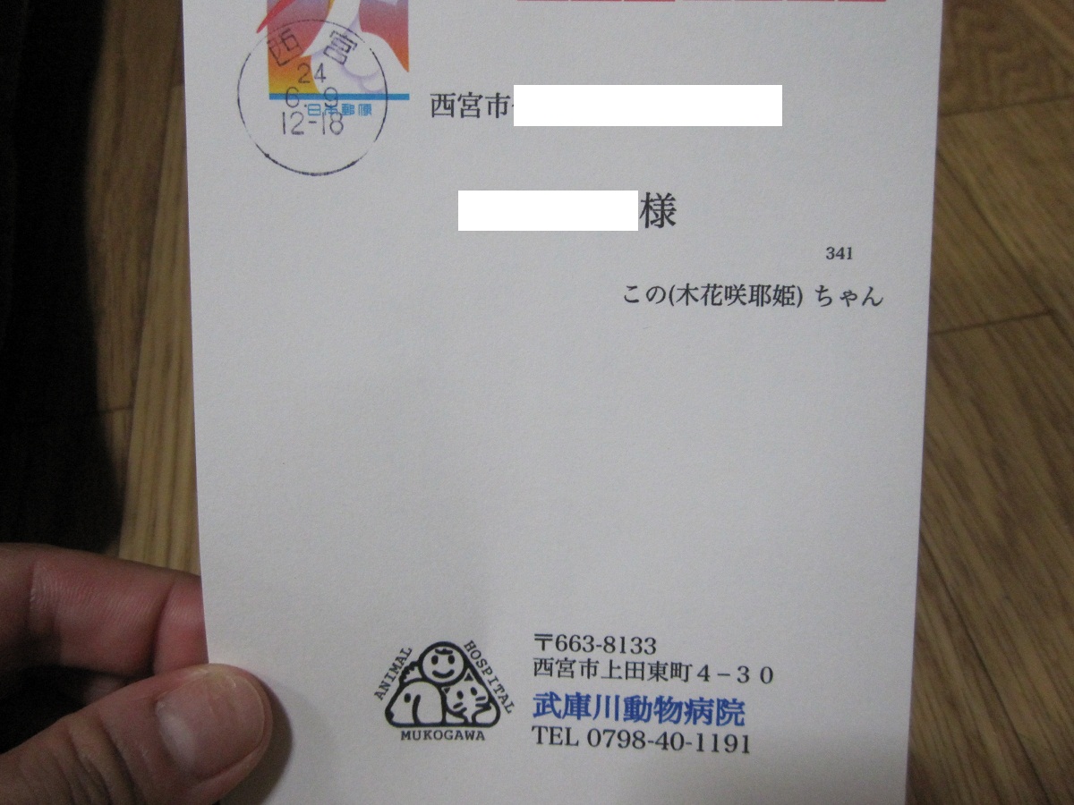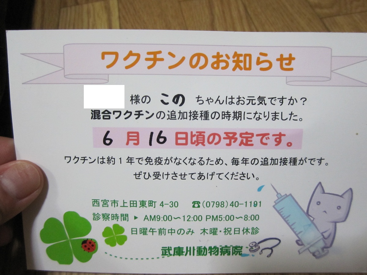 このちゃんの主治医からの『ワクチン接種』のお知らせハガキです