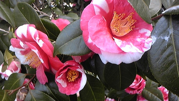 変な色の椿も咲いていたので、枝ごと折って、私に飾ったら