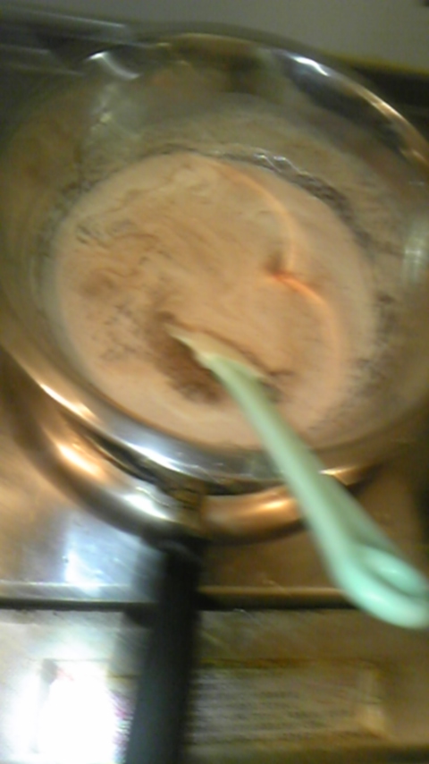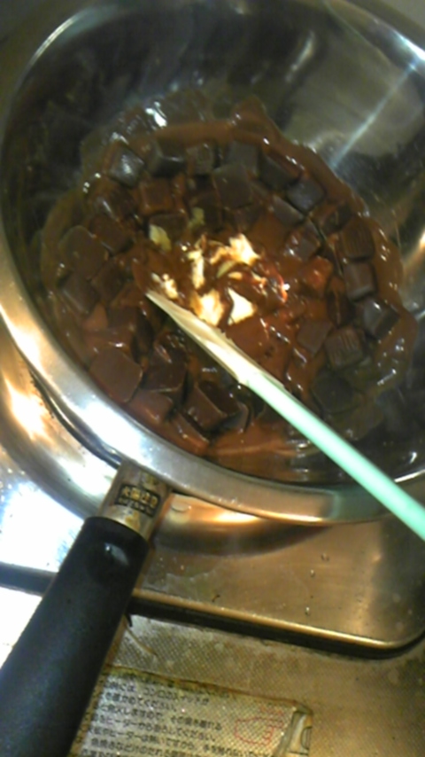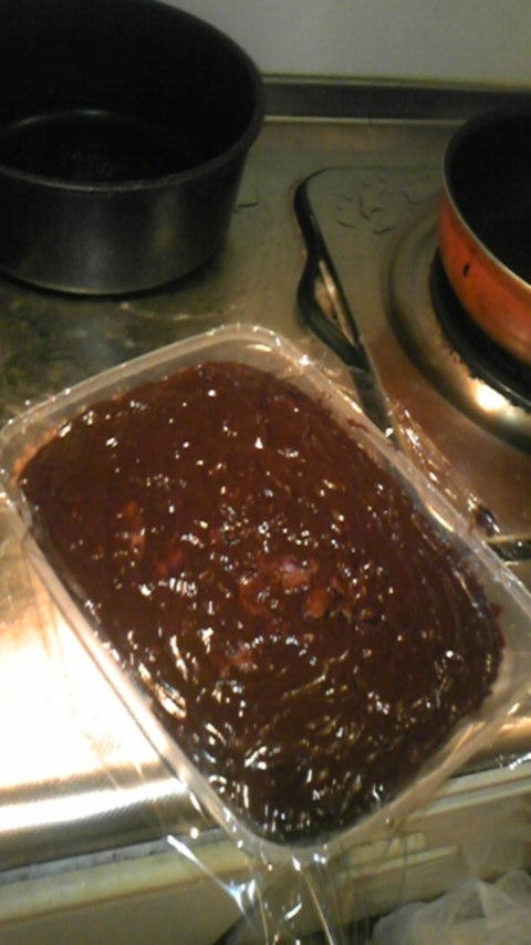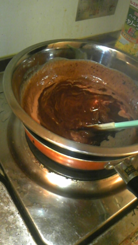 濃いチョコ色になったらラップを敷いた型に流し込みます